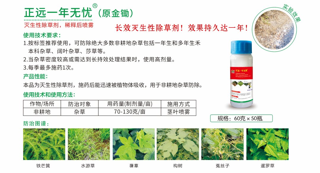 灭生性除草剂,稀释后喷雾 产品特点: 1.恶性杂草的克星:对恶性杂草、小灌木等效果突出。 2.见效快,持效期可达1个月。 3.施药后迅速被植物体吸收,耐雨水冲刷。 使用范围: 用于各种荒地、非耕地(如铁路、公路、高速公路、管道、木材 厂、露天仓库、泵站、围栏、非灌溉水渠、河岸等)及小灌木等。 使用方法:使用一套兑水15公斤,均匀喷雾。