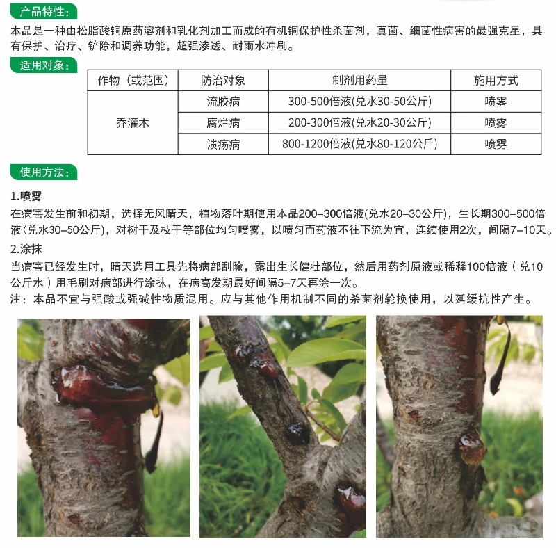 产品特性: 本品是一种由松脂酸铜原药溶剂和乳化剂加工而成的有机铜保护性杀菌剂,真菌、细菌性病害的最强克星,具 有保护、治疗、铲除和调养功能,超强渗透、耐雨水冲刷。 适用对象: 作物(或范围)
