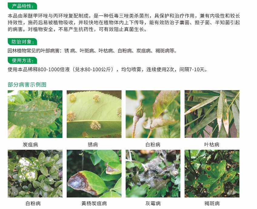 产品特性: 本品由苯醚甲环唑与丙环唑复配制成,是一种低毒三唑类杀菌剂,具保护和治疗作用,兼有内吸性和较长 持效性,施药后易被植物吸收,并较快地在植物体内上下传导,能有效防治子囊菌、担子菌、半知菌引起 的病害。对植物安全,不易产生抗药性,可有效阻止真菌生长。 防治对象: 园林植物常见的叶部病害:锈病、叶斑病、叶枯病、白粉病、炭疽病、褐斑病等。 使用方法: 使用本品稀释800-1000倍液(兑水80-100公斤),均匀喷雾,连续使用2次,间隔7-10天。
