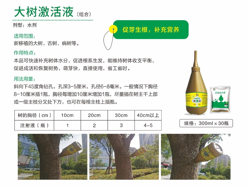 适用范围: 新移植的大树、古树、病树等。 作用特点: 本品可快速补充树体水分,促进根系生发,能维持树体收支平衡, 促进成活和恢复树势,萌芽快,直接使用,省工省时。 用法用量: 斜向下45度角钻孔,孔深3-5厘米,孔径6-8毫米。一般情况下胸径 8-10厘米插1瓶,胸径每增加10厘米增加1瓶,尽量插在树主干上部 或一级主枝分叉处下方,也可在每根主枝上插瓶。